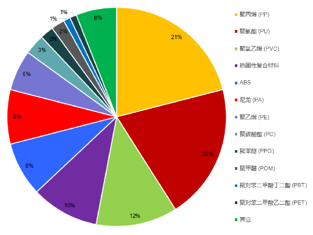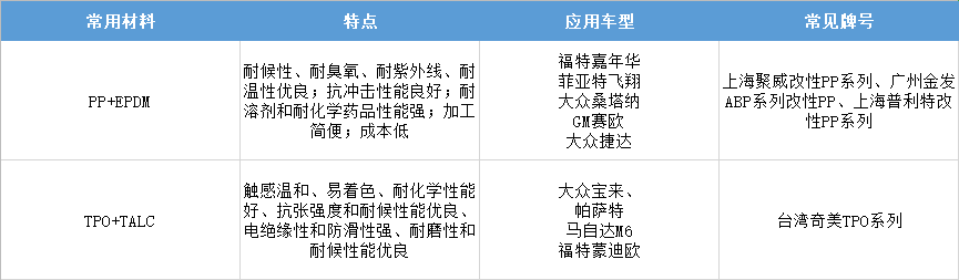 目前常用的外飾材料有 PP(聚丙烯)、ABS(丙烯腈-丁二烯-苯乙烯塑料)、ASA(苯乙烯、丙烯腈和壓克力橡膠共聚)、POM(聚甲醛)、PA(尼龍、聚酰胺)、PC(聚碳酸酯)、PE(聚乙烯)等,但具體到每一個零件所使用的材料又有所不同,以下針對具體的零部件系統介紹材料的選擇和應用情況。