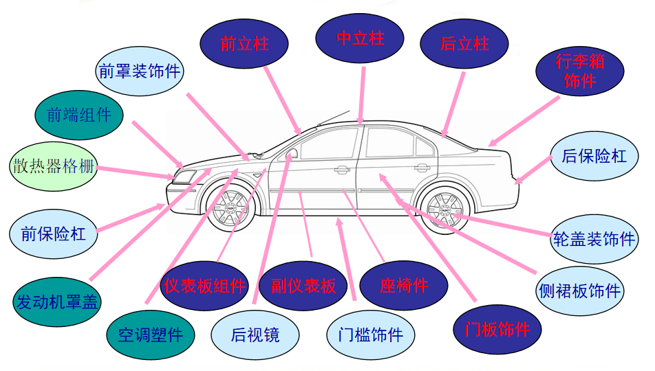 保險杠(前后,內襯),車身側裙板,防擦條,輪罩,輪蓋裝飾件,門檻,散熱器格柵,牌照板等。
