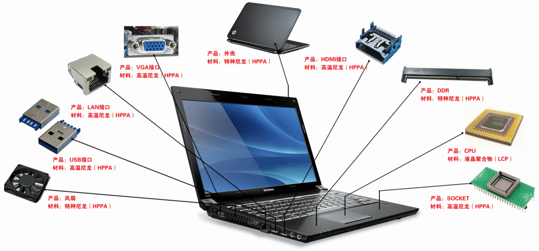 高溫尼龍可取代金屬達(dá)到輕薄設(shè)計(jì),可應(yīng)用在筆電外殼、平板外殼,優(yōu)異的耐高溫性和尺寸穩(wěn)定性使其在筆電的風(fēng)扇、接口廣泛應(yīng)用。